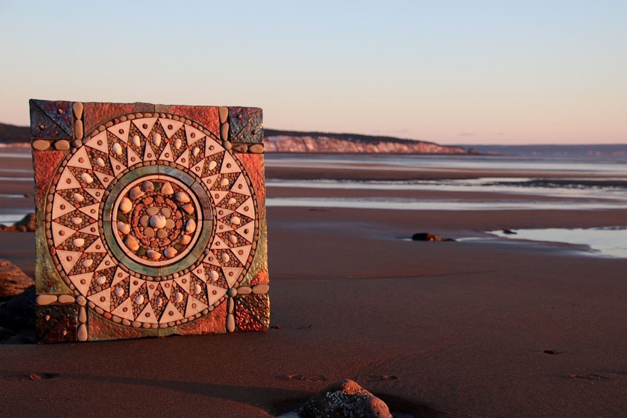 ‘Secrets of the Whispering Waves‘ – 24.5 inches (62 cm) diameter. Raku fired clay, stone, ocean tumbled brick, beach glass.